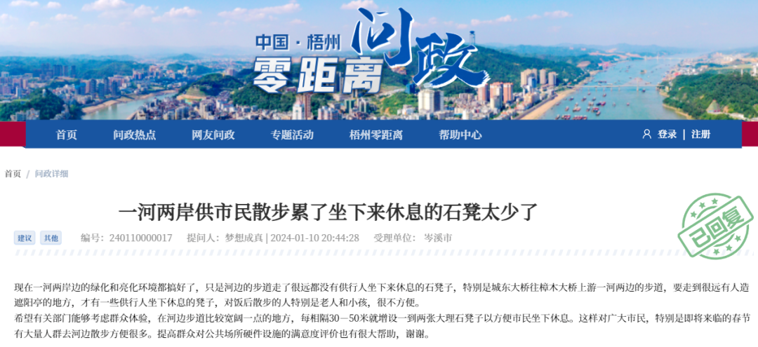 希望有關(guān)部門能夠考慮群眾體驗(yàn),在河邊步道比較寬闊一點(diǎn)的地方,每相隔30-50米就增設(shè)一到兩張大理石凳子以方便市民坐下休息。這樣對廣大市民,特別是即將來臨的春節(jié)有大量人群去河邊散步方便很多。提高群眾對公共場所硬件設(shè)施的滿意度評價也有很大幫助,謝謝。