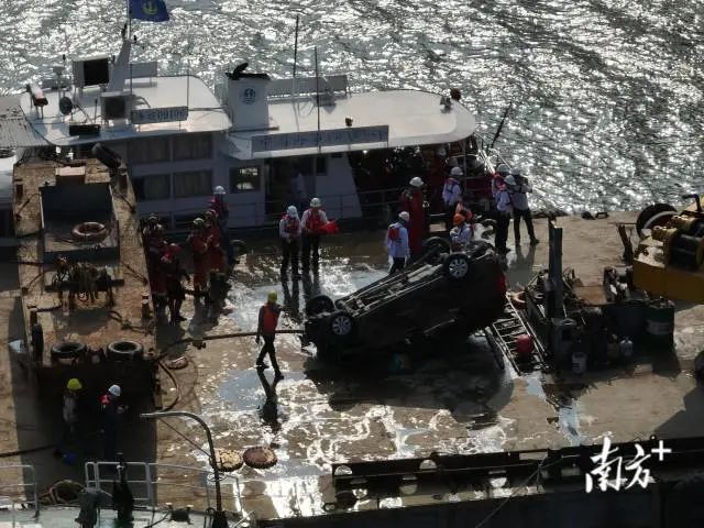 2月22日下午16時(shí)分許,南沙瀝心沙大橋事故搜救現(xiàn)場,第二輛落水車輛被打撈出水。