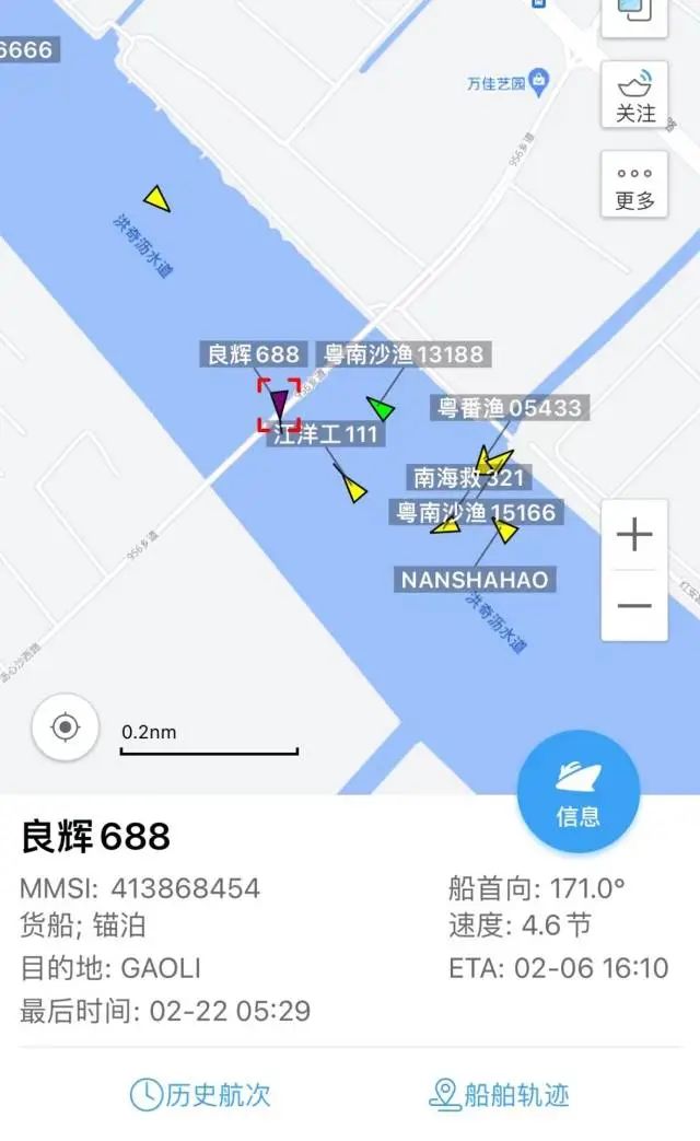 記者查詢船訊網(wǎng)發(fā)現(xiàn),肇事船只為貨船“良輝688”號,船長60米,船高18米。最后一次AIS(船舶自動(dòng)識別系統(tǒng))信息顯示,“良輝688”號于2月22日05時(shí)29分左右發(fā)送了位置,事發(fā)時(shí)航速為4.6節(jié)(海里/小時(shí))。