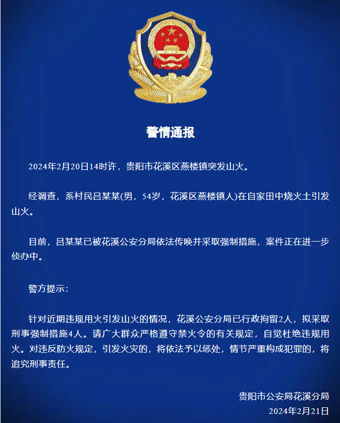 經(jīng)調(diào)查,系村民呂某某(男,54歲,花溪區(qū)燕樓鎮(zhèn)人)在自家田中燒火土引發(fā)山火。