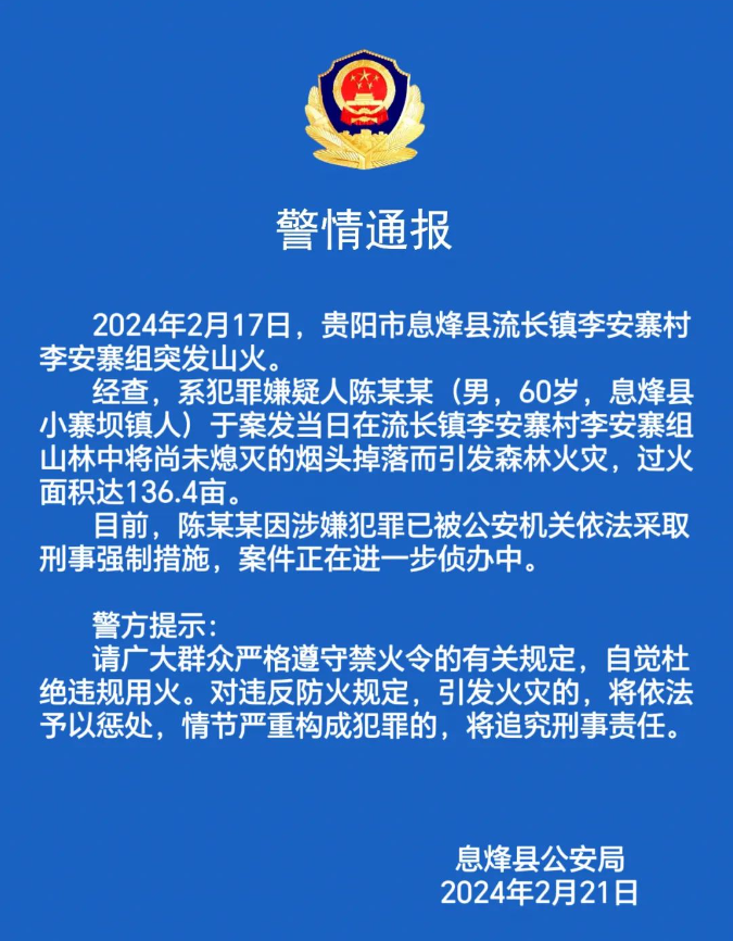 經(jīng)查,系犯罪嫌疑人陳某某(男,60歲,息烽縣小寨壩鎮(zhèn)人)于案發(fā)當(dāng)日在流長(zhǎng)鎮(zhèn)李安寨村李安寨組山林中將尚未熄滅的煙頭掉落而引發(fā)森林火災(zāi),過(guò)火面積達(dá)136.4畝。