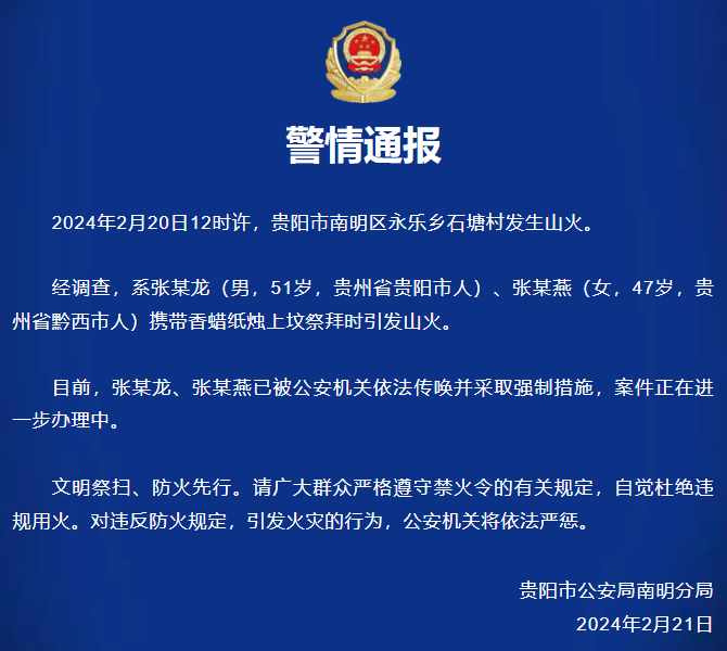 經(jīng)調(diào)查,系張某龍(男,51歲,貴州省貴陽(yáng)市人)、張某燕(女,47歲,貴州省黔西市人)攜帶香蠟紙燭上墳祭拜時(shí)引發(fā)山火。
