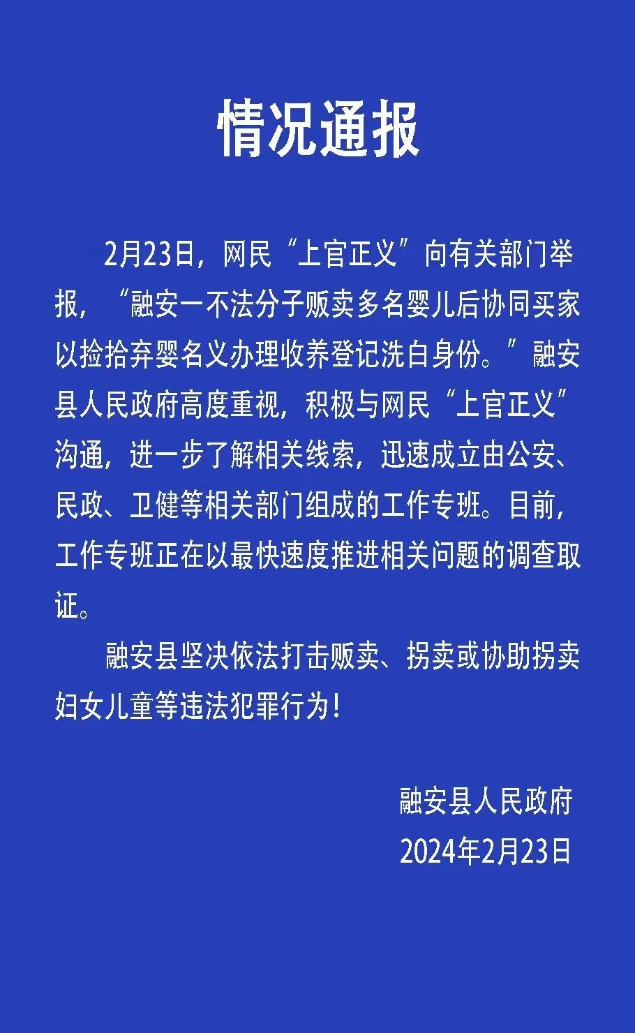 針對上述情況,柳州市融安縣人民政府2月23日晚間發(fā)布通報,稱網民“上官正義”向有關部門舉報,“融安一不法分子販賣多名嬰兒后協同買家以撿拾棄嬰名義辦理收養(yǎng)登記洗白身份?!痹摽h已經成立工作專班,以最快速度調查取證。