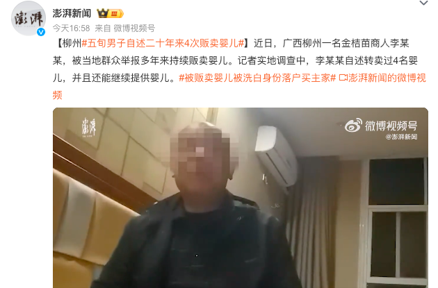 “上官正義”提到,2017年,李某某曾幫助融安縣一韋姓男子以3萬元的價格買入一名男嬰?!袄钅衬匙苑Q已經幫多個家庭成功介紹了孩子,通過他還能預訂孩子。”