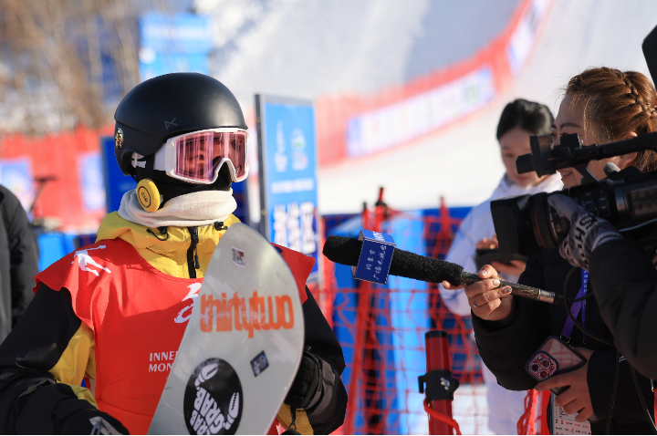 ▲?2月23日,獲得單板滑雪公開組女子大跳臺冠軍的廣西選手甘佳佳賽后接受記者采訪。李峰? 攝