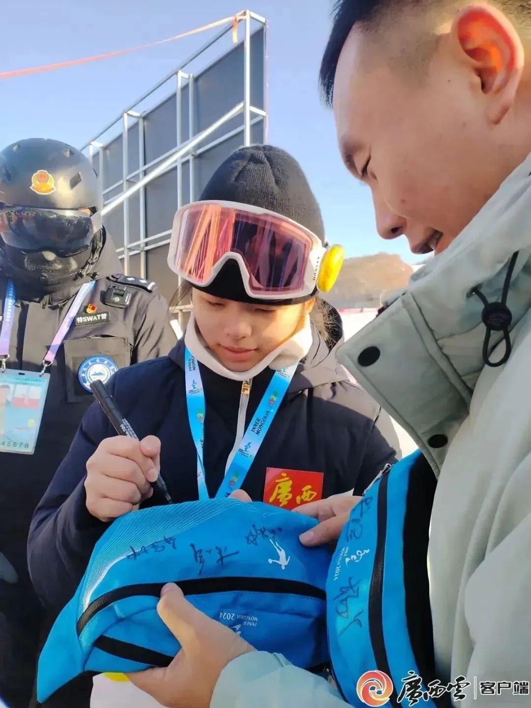 ▲?獲得單板滑雪公開組女子大跳臺冠軍的廣西選手甘佳佳為粉絲簽字。農(nóng)芝 攝