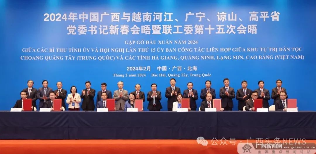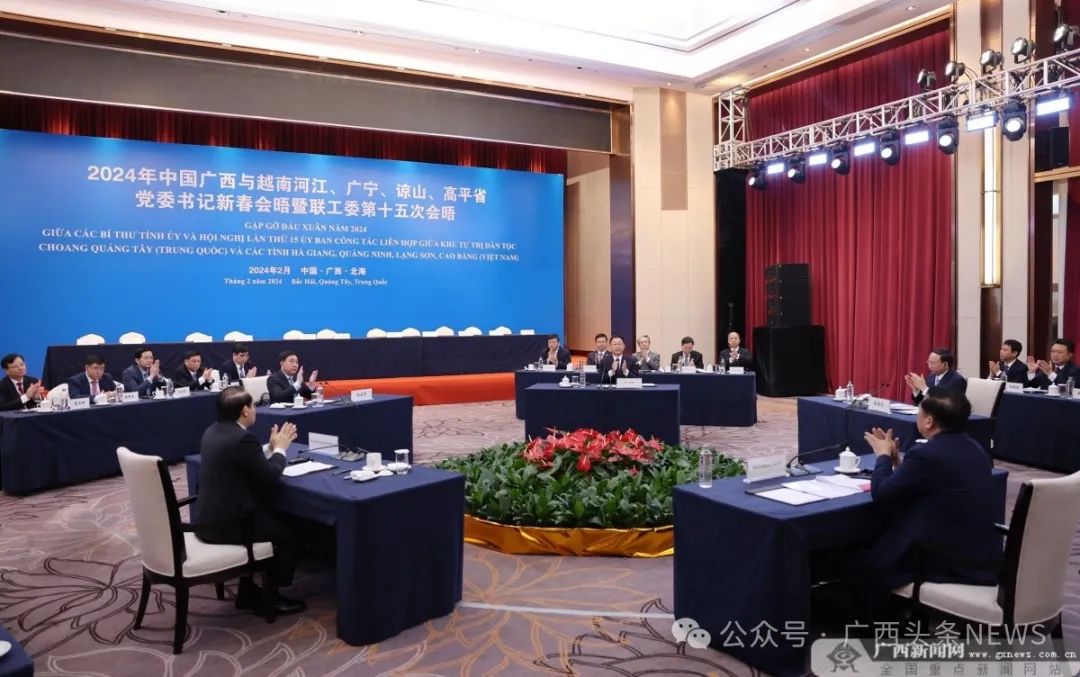 2024年2月28日,2024年中國(guó)廣西與越南河江、廣寧、諒山、高平邊境四省黨委書記新春會(huì)晤暨聯(lián)工委第十五次會(huì)晤在中國(guó)廣西壯族自治區(qū)北海市舉行。中國(guó)共產(chǎn)黨廣西壯族自治區(qū)委員會(huì)書記劉寧同志與越南共產(chǎn)黨河江省委員會(huì)代理書記阮孟勇同志、廣寧省委員會(huì)書記阮春記同志、諒山省委員會(huì)書記阮國(guó)團(tuán)同志、高平省委員會(huì)書記陳紅明同志(以下稱為“各方”)出席會(huì)晤。