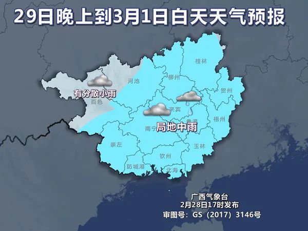 29日晚上到3月1日白天,桂東、桂南陰天有小雨、局地中雨,其它地區(qū)陰天有分散小雨。高寒山區(qū)和桂北局地有雨夾雪、凍雨、冰凍和道路結冰。最低氣溫:高寒山區(qū)-4~2℃,桂東北2~6℃,其它地區(qū)7~11℃。