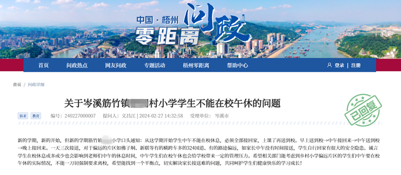 新的學(xué)期,新的開始,但新的學(xué)期筋竹鎮(zhèn)某某小學(xué)口頭通知:從這學(xué)期開始學(xué)生中午不能在校休息,必須全部接回家,上課了再送到校。早上送到?!形缃踊貋怼形缢偷叫!砩辖踊貋?。一天三次接送,對(duì)于偏遠(yuǎn)的片區(qū)如佛子垌、新聯(lián)等有的橫跨車多的324國道、有的路途偏遠(yuǎn),如家長中午沒有時(shí)間接送,學(xué)生自行回家有很大的安全隱患。誠言學(xué)生在校休息或多或少也會(huì)影響到老師們中午的休息時(shí)間,中午學(xué)生們?cè)谛N缧菀矔?huì)給學(xué)校帶來一定的管理壓力。希望相關(guān)部門能考慮到鄉(xiāng)村小學(xué)偏遠(yuǎn)片區(qū)的學(xué)生們中午要在校午休的實(shí)際情況,不能一刀切強(qiáng)制要求離校,希望能找到一個(gè)平衡點(diǎn),切實(shí)解決家長接送難的問題,共同呵護(hù)學(xué)生們健康快樂的學(xué)習(xí)成長!