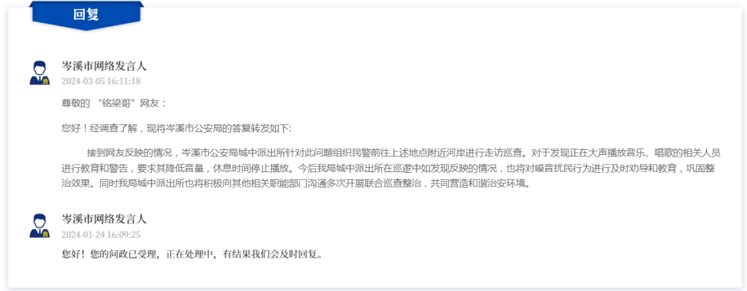 接到網(wǎng)友反映的情況,岑溪市公安局城中派出所針對(duì)此問題,組織民警前往上述地點(diǎn)附近河岸進(jìn)行走訪巡查。對(duì)于發(fā)現(xiàn)正在大聲播放音樂、唱歌的相關(guān)人員進(jìn)行教育和警告,要求其降低音量,休息時(shí)間停止播放。今后我局城中派出所在巡邏中如發(fā)現(xiàn)反映的情況,也將對(duì)噪音擾民行為進(jìn)行及時(shí)勸導(dǎo)和教育,鞏固整治效果。同時(shí)我局城中派出所也將積極向其他相關(guān)職能部門溝通,多次開展聯(lián)合巡查整治,共同營(yíng)造和諧治安環(huán)境。