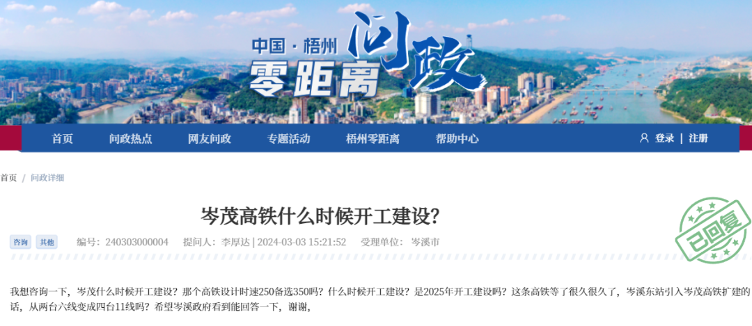 岑茂高鐵什么時候開工建設(shè)?是2025年開工建設(shè)嗎?該高鐵項(xiàng)目,設(shè)計(jì)時速250,備選350嗎?這條高鐵等了很久很久了,岑溪東站引入岑茂高鐵擴(kuò)建的話,將從兩臺6線變成四臺11線嗎?希望岑溪政府看到能回答一下。▲網(wǎng)友問政截圖