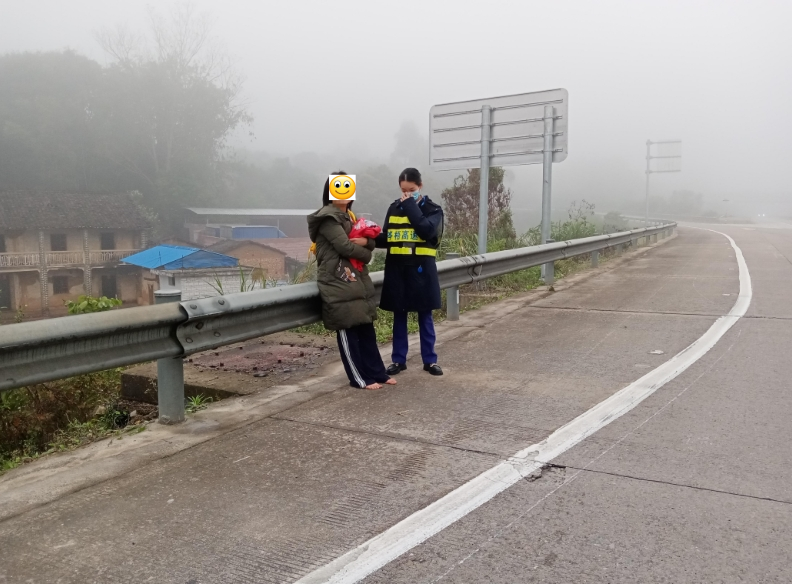 當(dāng)天早上,霧氣濃重,路面能見度較低,收費(fèi)站的工作正緊張有序地進(jìn)行著。突然,當(dāng)班收費(fèi)員發(fā)現(xiàn)一名女子光著腳,正在高速上行走,立即上前攔截并詢問情況。