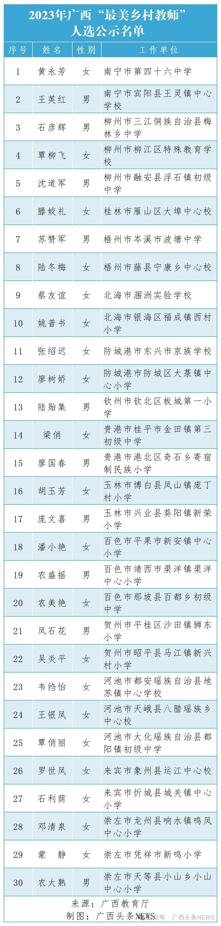根據(jù)《自治區(qū)教育廳關(guān)于開(kāi)展2023年廣西“最美鄉(xiāng)村教師”推薦活動(dòng)的通知》(桂教教師〔2023〕75號(hào))精神,在全區(qū)自下而上推薦的基礎(chǔ)上,經(jīng)專(zhuān)家評(píng)審、會(huì)議審定,擬確定黃永芳等30位同志為2023年廣西“最美鄉(xiāng)村教師”人選,現(xiàn)將名單予以公示(具體名單見(jiàn)附件)。公示期為5個(gè)工作日,從2024年3月28日起至4月3日止。公示期內(nèi),如對(duì)公示名單有異議的,請(qǐng)以書(shū)面形式,并署真實(shí)姓名、聯(lián)系地址和聯(lián)系電話,于2024年4月3日前郵寄或送達(dá)我廳教師工作處(地址:南寧市竹溪大道69號(hào)自治區(qū)教育廳1921辦公室,郵編:530021),郵寄以郵戳為準(zhǔn),直接送達(dá)以送達(dá)日期為準(zhǔn)。聯(lián)系電話:0771-5815208。