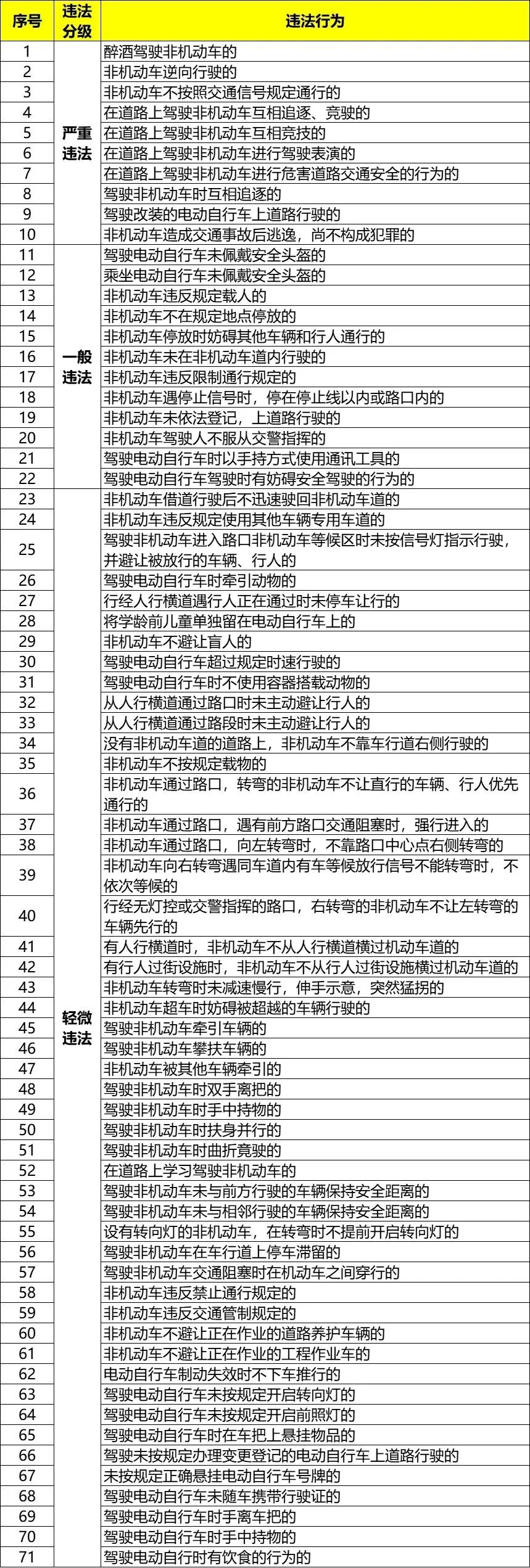 清單中涵蓋的違法行為多達71項,分為嚴重交通違法行為、一般交通違法行為以及輕微交通違法行為。除了常見的未按規(guī)定佩戴頭盔、超速、闖紅燈、亂停亂放等常見的交通違法外,騎車牽引動物、邊車邊吃東西以及騎行過程中手持物品、不避讓盲人等行為均屬于交通違法行為。