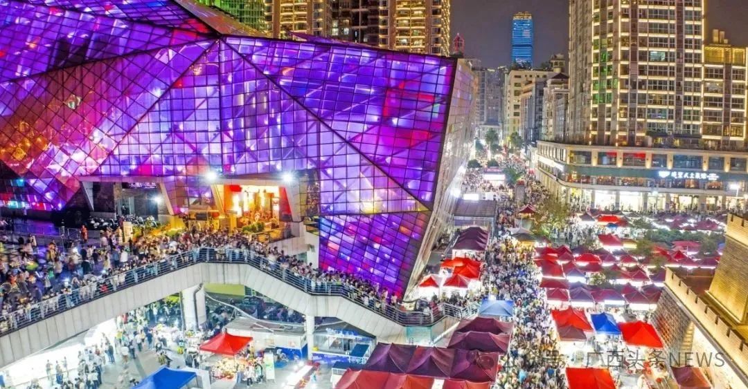 圖為假期期間柳州風(fēng)情港夜市人潮涌動(dòng)。來(lái)源:廣西商務(wù)廳