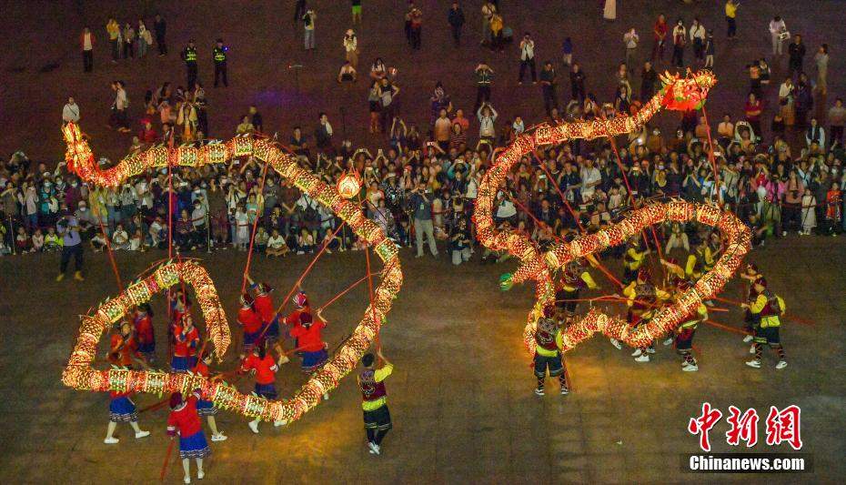 4月11日晚,在南寧國際會展中心舉行的舞龍表演,吸引民眾觀看。