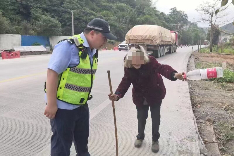 4月11日下午15時(shí)許,岑溪市公安局交通管理大隊(duì)執(zhí)勤警員在國(guó)道324線黃陵公安檢查站執(zhí)勤時(shí)發(fā)現(xiàn)一位手里拄著拐杖的駝背老人在公路邊蹣跚而行,公路上車輛來往較多且車速較快,出于安全考慮,執(zhí)勤警員立即上前詢問老人情況,“大娘,您要去哪里?是否需要幫助?”