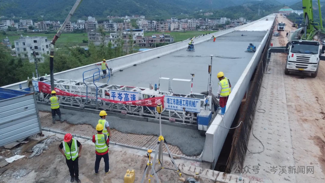 從高空俯瞰,如今的義昌江特大橋已初現(xiàn)雛形,施工人員正加緊進(jìn)行橋面鋪裝作業(yè),水泥泵車、攤鋪機(jī)等設(shè)備齊上陣,各項(xiàng)工作有條不紊地推進(jìn)中。