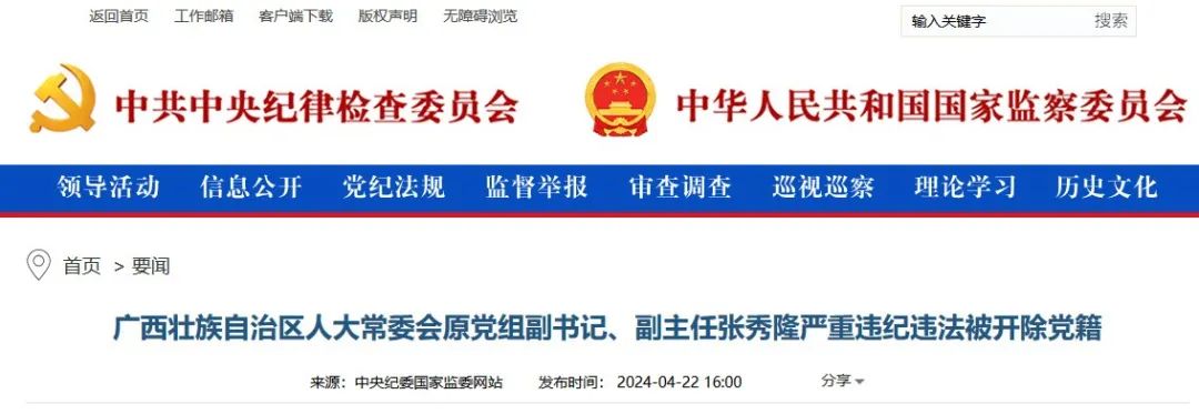 據中央紀委國家監(jiān)委網站4月22日消息,經中共中央批準,中央紀委國家監(jiān)委對廣西壯族自治區(qū)人大常委會原黨組副書記、副主任張秀隆嚴重違紀違法問題進行了立案審查調查。