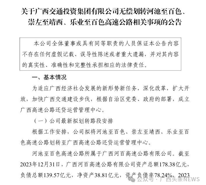 河池至百色高速公路所屬于廣西河百高速公路公司。截至2023年12月31日,廣西河百高速公路公司資產(chǎn)總額178.38億元,負(fù)債總額139.57億元,凈資產(chǎn)38.81億元,資產(chǎn)負(fù)債率78.24%,2023年度虧損4.39億元。廣西交通投資集團(tuán)擬劃轉(zhuǎn)其資產(chǎn)165.51億元,負(fù)債128.88億元,凈資產(chǎn)36.63億元。
