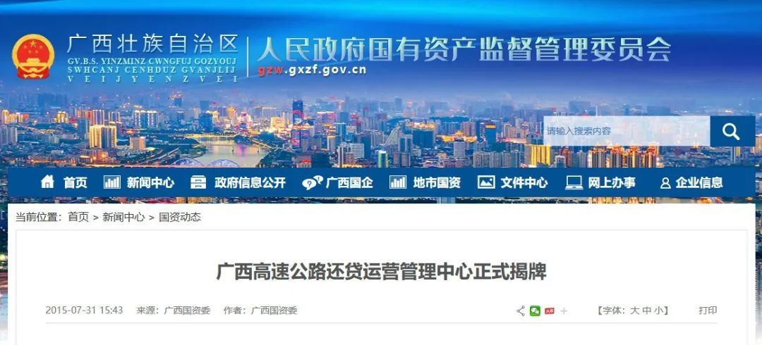 2015年7月,廣西國資委發(fā)布消息,廣西高速公路還貸運(yùn)營管理中心在南寧揭牌運(yùn)營。為促進(jìn)廣西高速公路事業(yè)發(fā)展,自治區(qū)人民政府批準(zhǔn)同意組建廣西高速公路還貸運(yùn)營管理中心,并授權(quán)廣西交通投資集團(tuán)對還貸中心進(jìn)行經(jīng)營、管理。該中心性質(zhì)為事業(yè)單位法人,整合政府還貸高速公路資源,發(fā)揮政府還貸高速公路功能,籌集資金支持全區(qū)高速公路建設(shè)。