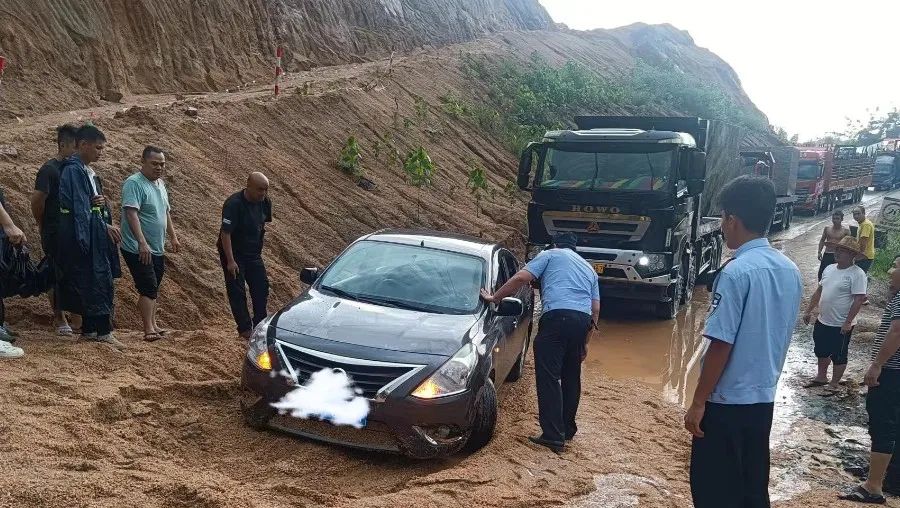 岑溪市公安局民輔警及時救助被道路旁塌方泥漿困住的車輛。