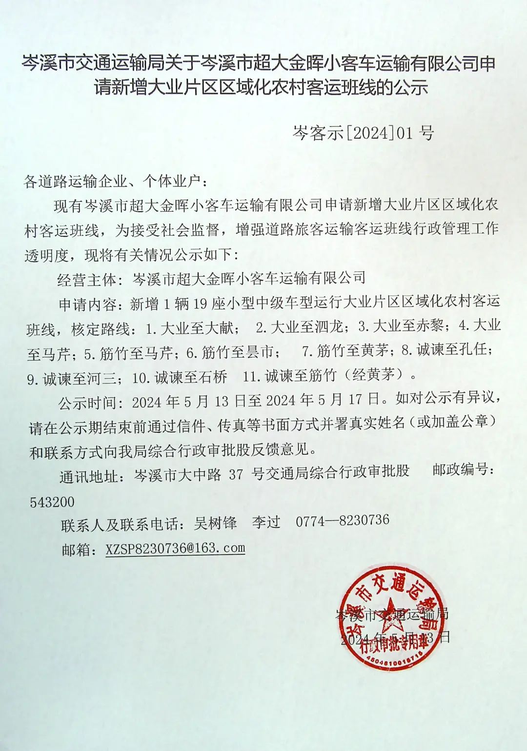 岑溪市交通運(yùn)輸局關(guān)于岑溪市超大金暉小客車運(yùn)輸有限公司申請新增大業(yè)片區(qū)區(qū)域化農(nóng)村客運(yùn)班線的公示