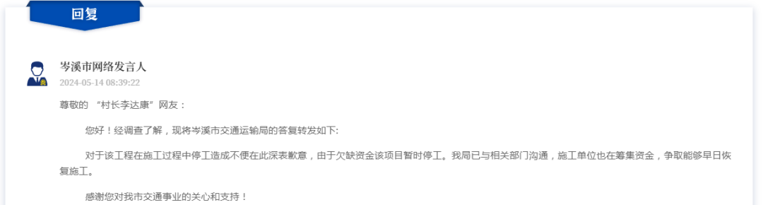 5月14日,官方回應(yīng)來了,停工原因也明了!據(jù)岑溪市交通運輸局答復(fù)表示:對于該工程在施工過程中停工造成不便在此深表歉意,由于欠缺資金該項目暫時停工。我局已與相關(guān)部門溝通,施工單位也在籌集資金,爭取能夠早日恢復(fù)施工。據(jù)岑溪新聞網(wǎng)今年1月5日報道,水汶至楊村公路雙車道改造項目,計劃總投資664萬元,其時已完成工程招標(biāo),施工單位已進場施工。