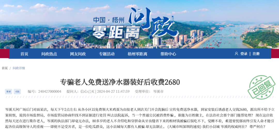 岑溪天河廣場后門對面某店,每天下午2點左右 從各小區(qū)以免費領(lǐng)大米雞蛋為由接老人到店關(guān)門開會洗腦后宣傳免費送凈水器,到家安裝后誘惑老人交錢2680,派出所不給予立案偵察,說找市場監(jiān)督局,市場監(jiān)管局協(xié)商但找不到證據(jù)進行處罰 叫去法院起訴,當(dāng)一個普通公民被消費炸騙 ,誰能為百姓做主,在法治社會那個部門能幫處理?現(xiàn)在這店依然每天還在進行欺詐老人,岑溪的執(zhí)法部門卻毫無辦法,80多歲的老人不舍得吃和穿拼命從牙齒縫省下來的棺材錢被騙后飯吃不下,覺睡不著,難道要憂郁而終引發(fā)人命才能引起各位高級領(lǐng)導(dǎo)人的重視……即使不是受害者,是一位吃瓜群眾,這小縣城每天都有人被騙 卻無法制止。(大城市叫深圳的速度) 我們小縣城 岑溪的權(quán)威何在?尊嚴(yán)何在?