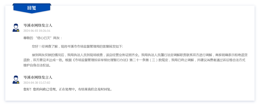 您好!經(jīng)調(diào)查了解,現(xiàn)將岑溪市市場監(jiān)督管理局的答復(fù)轉(zhuǎn)發(fā)如下: