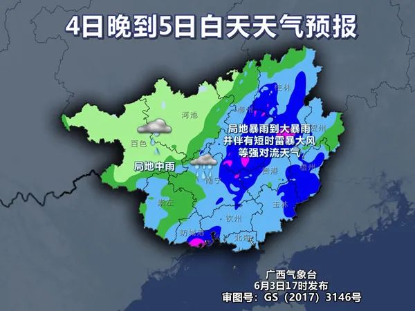 4日晚上到5日白天,桂東、桂南有大雨、局地暴雨到大暴雨并伴有短時雷暴大風等強對流天氣,其它地區(qū)有小雨、局地中雨。5日晚上到6日白天,桂東、桂南有中雨、局地暴雨并伴有短時雷暴大風等強對流天氣,其它地區(qū)多云有陣雨、局地中雨。(廣西天氣)
