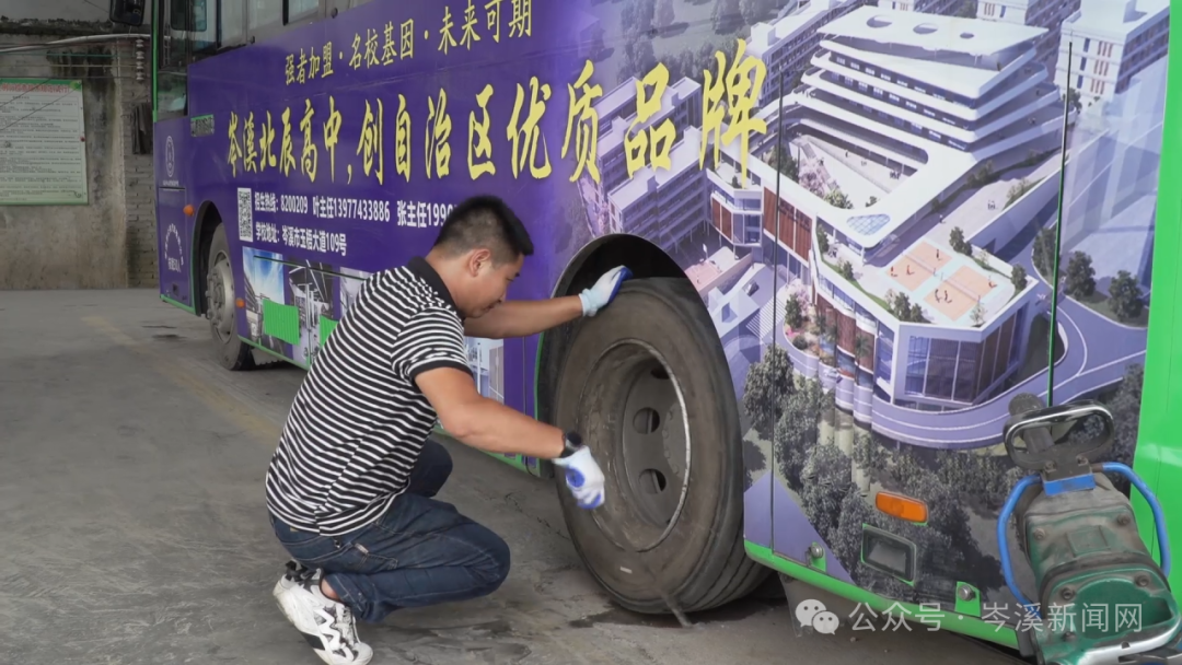在岑溪市公共汽車有限公司,工作人員正對參加高考接送任務的公交車輛進行嚴格安檢,重點對公交車上的安全錘、滅火器等各項設施設備是否符合要求,輪胎、燈光等車輛技術狀況是否良好,進行了全面細致的檢查,切實保障車輛在送考期間安全行駛。