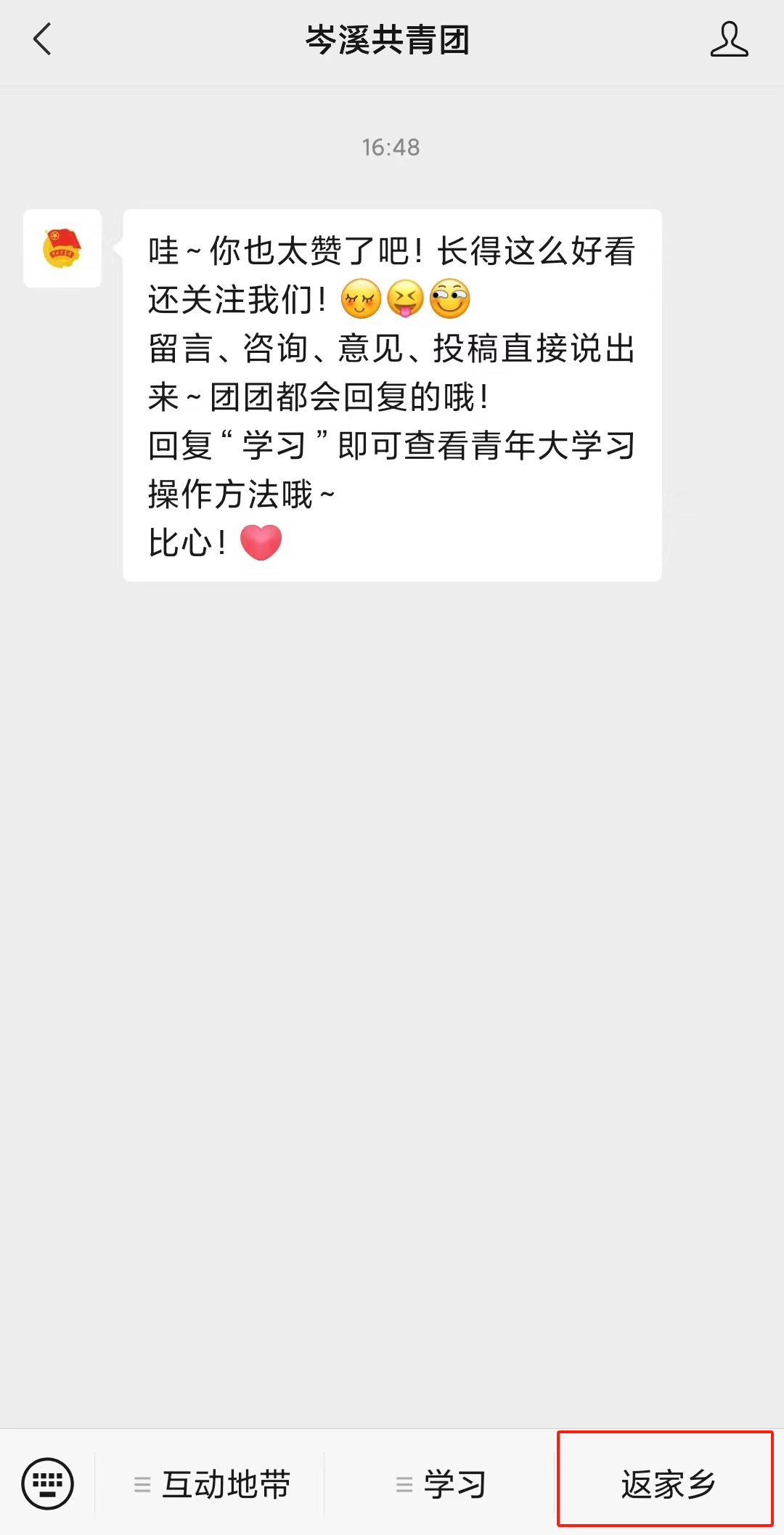 第一步:關(guān)注“岑溪共青團(tuán)”微信公眾號(hào),在底部菜單欄找到“返家鄉(xiāng)”并點(diǎn)擊進(jìn)入返家鄉(xiāng)官方平臺(tái),按照系統(tǒng)提示進(jìn)行注冊、登錄。