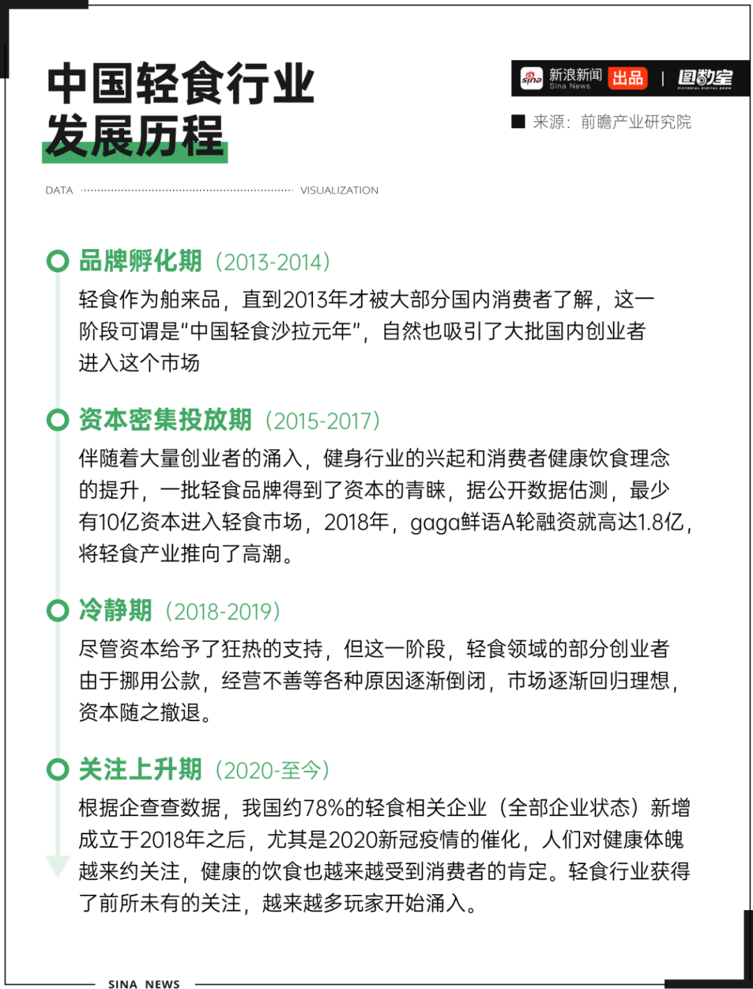 但水滿則溢,月盈則虧。2018-2019年,由于部分創(chuàng)業(yè)者挪用公款、經(jīng)營不善等各種原因逐漸倒逼,資本隨之撤退,行業(yè)步入冷靜期。2020年至今,隨著消費(fèi)者對(duì)健康飲食的重視,輕食又重新得到消費(fèi)者青睞,新的玩家開始涌入,行業(yè)又迎來了新的上升期。