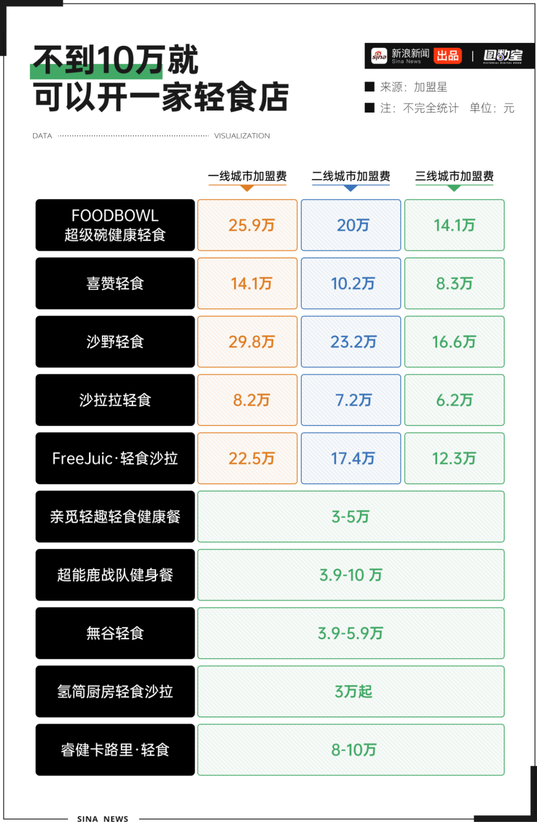 輕食可以算作是輕資產(chǎn)投入項(xiàng)目。相比于動(dòng)輒大幾十萬的茶飲、火鍋行業(yè)的加盟費(fèi),輕食店的加盟費(fèi)就顯得“平易近人”了許多,對(duì)設(shè)備和原材料的要求也不像傳統(tǒng)餐飲那樣高。我們盤點(diǎn)了10家輕食品牌的加盟費(fèi),發(fā)現(xiàn)加盟費(fèi)大多在10萬元上下。換句話說,創(chuàng)業(yè)者投資不到10萬元,就可以再開一家輕食店了。