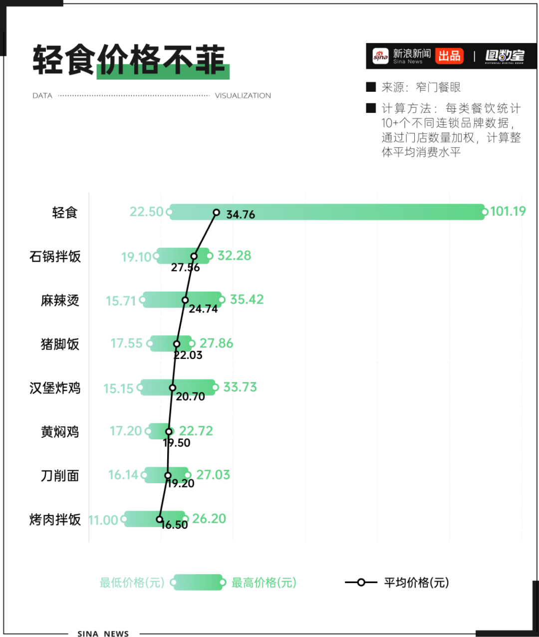 圖數(shù)室統(tǒng)計(jì)了打工人常點(diǎn)快餐的均價(jià),發(fā)現(xiàn)就連童年奢侈品漢堡炸雞都越來越接地氣,15吃飽,30吃好,平均花費(fèi)只需要20元左右。而輕食整體的均價(jià)在34.76元,最高超過100元,可謂一騎絕塵。