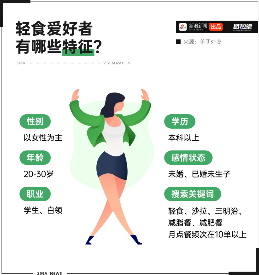 據(jù)美團(tuán)外賣大數(shù)據(jù),輕食的忠實(shí)粉絲以20至30歲年輕女性為主,她們有著高學(xué)歷,對(duì)健康膳食和身體管理追求較高。她們可能是辦公室里的“女強(qiáng)人”,或是校園里的“學(xué)霸女神”,用月點(diǎn)10單的實(shí)際行動(dòng),展示著對(duì)健康生活的熱愛。