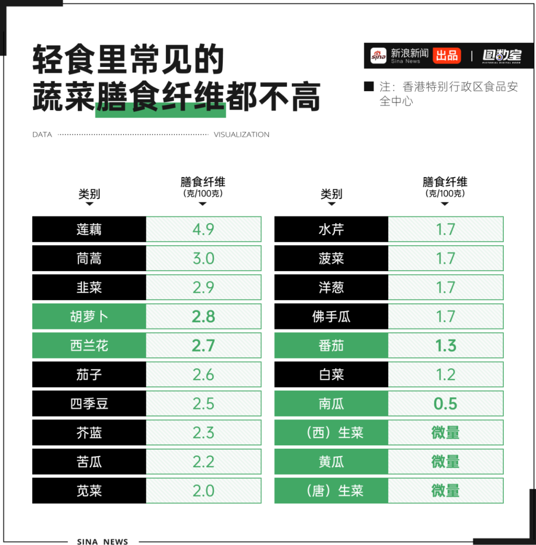 但輕食受限于制作流程,蔬菜種類很單一,綠色蔬菜一個(gè)手就能數(shù)過來:生菜、西蘭花、西葫蘆、黃瓜,其余的不是圣女果就是胡蘿卜。其中最常見的生菜、黃瓜膳食纖維含量在所有蔬菜中排名倒數(shù),可以忽略不計(jì)。