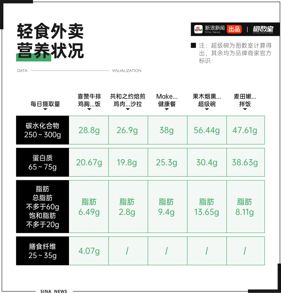 市面上的輕食真能符合這一標(biāo)準(zhǔn)嗎?圖數(shù)室整理了五家輕食品牌的高銷量產(chǎn)品,發(fā)現(xiàn)碳水化合物、蛋白質(zhì)和膳食纖維都有不足。如果按照品牌標(biāo)注,那么碳水化合物真的很少,如果瘦了完全是因?yàn)槌圆伙栶I瘦的。