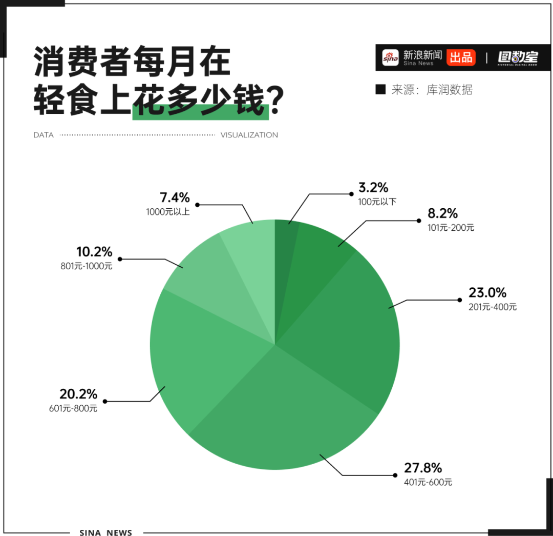 不過,高格調(diào)的生活方式,往往意味著昂貴的代價(jià),輕食的價(jià)格讓很多人愛不起來。一項(xiàng)面向500人的調(diào)查顯示,27.8%的受訪者每月在輕食上的花費(fèi)高達(dá)401-600元,如果按照10單外賣來計(jì)算,每餐輕食均價(jià)可達(dá)到41-60元。這還只是中位數(shù),更有甚者,7.4%的人月花費(fèi)在1000元以上。