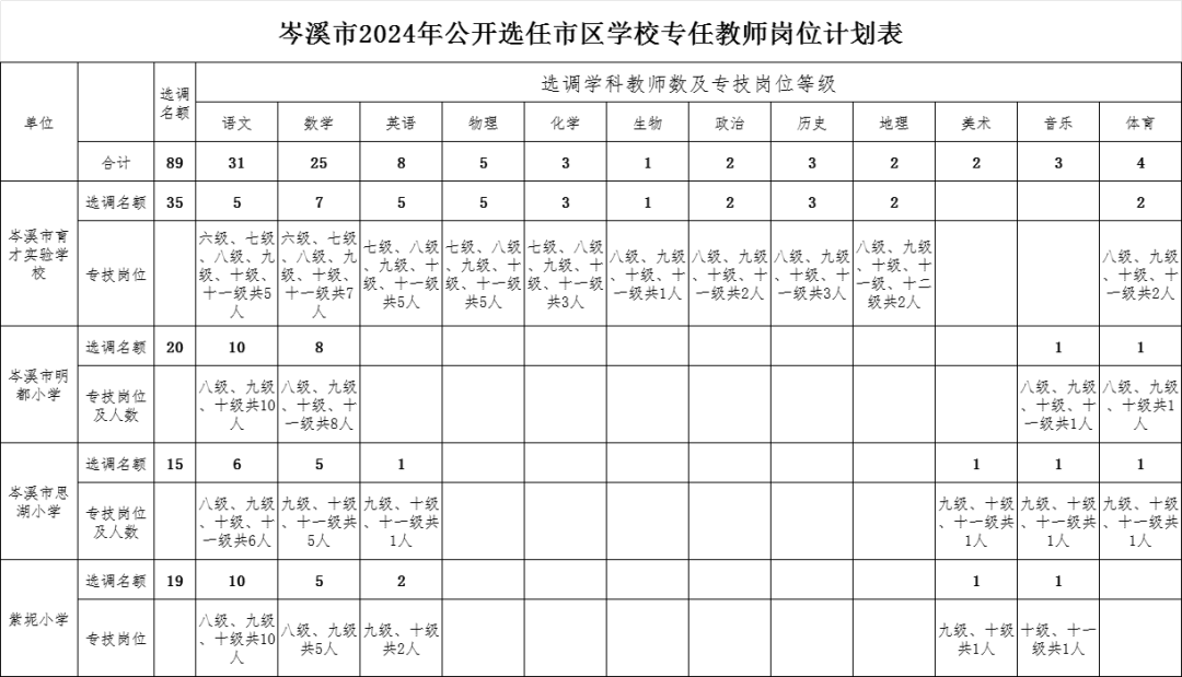 選任岑溪市育才實驗學(xué)校初中教師35名,明都小學(xué)20人,思湖小學(xué)教師15名,紫坭小學(xué)19名,共89名。具體學(xué)科、崗位及人數(shù)見附件1《岑溪市2024年公開選任市區(qū)學(xué)校專任教師崗位計劃表》。