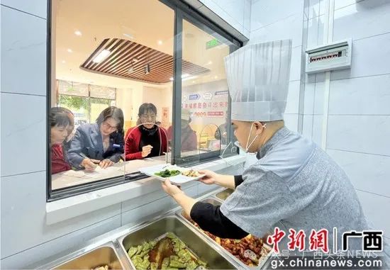圖為廣西南寧一社區(qū)食堂,工作人員正在為長者出餐。許麗媛 攝
