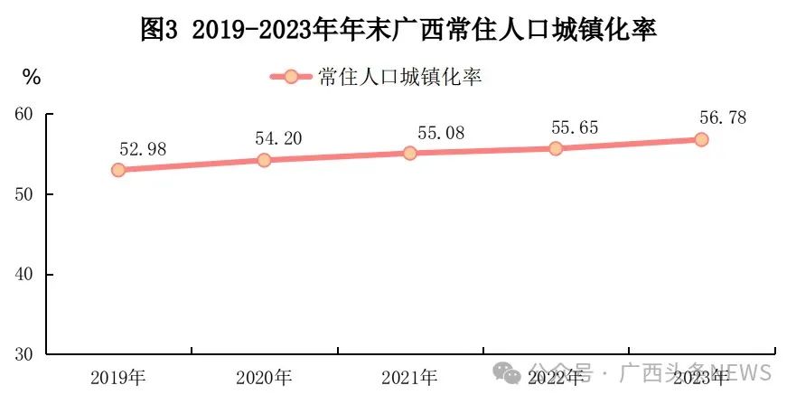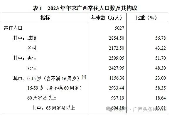 近日,廣西自治區(qū)統(tǒng)計局公布了2023年全區(qū)人口變動情況。數(shù)據(jù)顯示,2023年末,廣西全區(qū)常住人口為5027萬人,相較于2022年末的5047萬人,減少了20萬人。盡管常住人口數(shù)量有所下降,但值得注意的是,城鎮(zhèn)人口數(shù)量達到2854.50萬人,占常住人口比重(常住人口城鎮(zhèn)化率)為56.78%,較上年末提升了1.13個百分點。