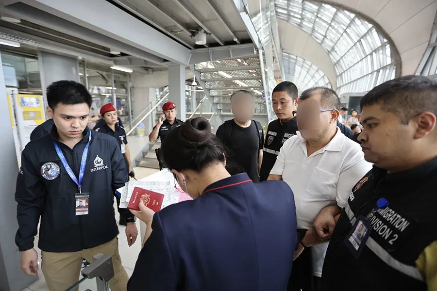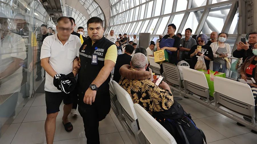 ▲8月20日,在泰國移民局與國際刑警組織的協(xié)助下,嫌疑人張某某被押解上飛機(jī)。