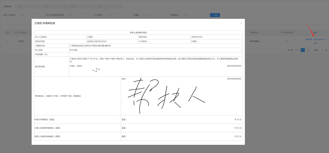 點(diǎn)擊【查看申請(qǐng)審批表】可查看該戶的申請(qǐng)表信息。村委后續(xù)可以打印申請(qǐng)表進(jìn)行線下蓋章。(導(dǎo)出功能預(yù)警8月5號(hào)上線)