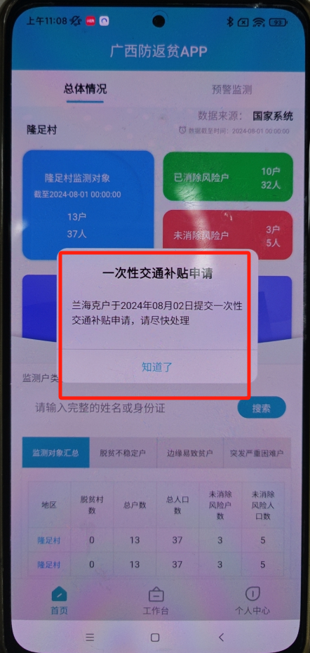 幫扶人進(jìn)入APP后會(huì)收到結(jié)對(duì)戶所提交的跨省交通補(bǔ)貼申報(bào)信息,在工作臺(tái)點(diǎn)擊【幫扶手冊(cè)】進(jìn)入我的幫扶對(duì)象列表。列表顯示已申請(qǐng)跨省交通補(bǔ)貼標(biāo)簽的戶。