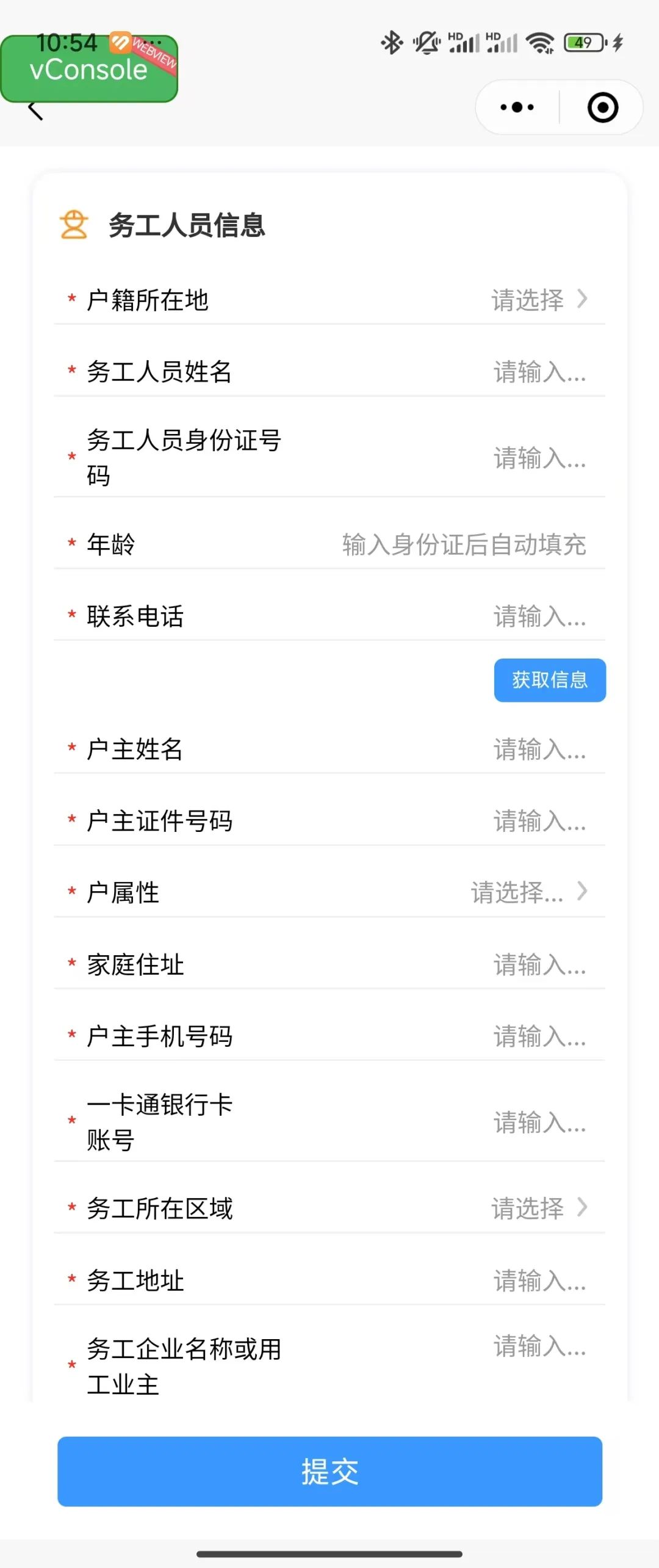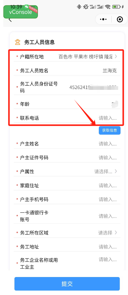 (2)填寫戶籍所在地、務(wù)工人員信息后,點(diǎn)擊【獲取信息】可以自動(dòng)生成戶主信息以及外出務(wù)工自證說明。