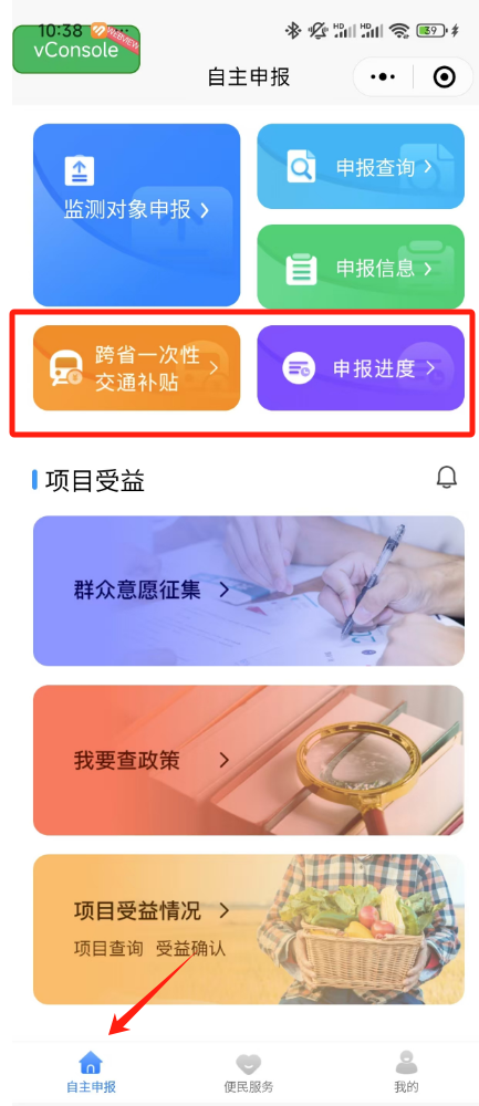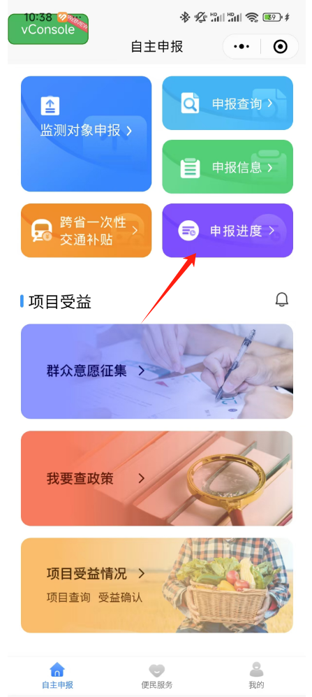 (4)完成提交后可在首頁點(diǎn)擊【申報(bào)進(jìn)度】查詢申報(bào)情況。