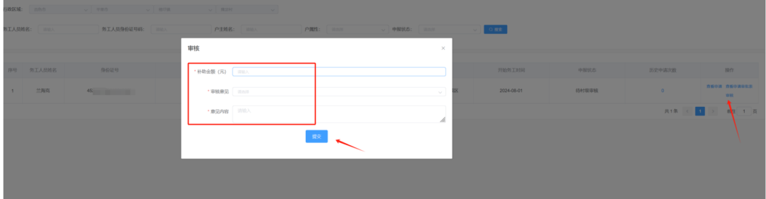 村委點(diǎn)擊【審核】按鈕彈出窗口進(jìn)行審核,補(bǔ)貼金額根據(jù)當(dāng)?shù)卣?,由村委進(jìn)行填寫。
