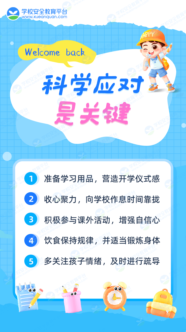為了積極應(yīng)對(duì)“開(kāi)學(xué)綜合征”,保證孩子以最佳狀態(tài)投入到新的學(xué)習(xí)生活中,家長(zhǎng)要幫助孩子早規(guī)劃、早準(zhǔn)備,順利迎接開(kāi)學(xué)。